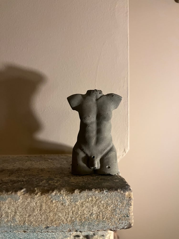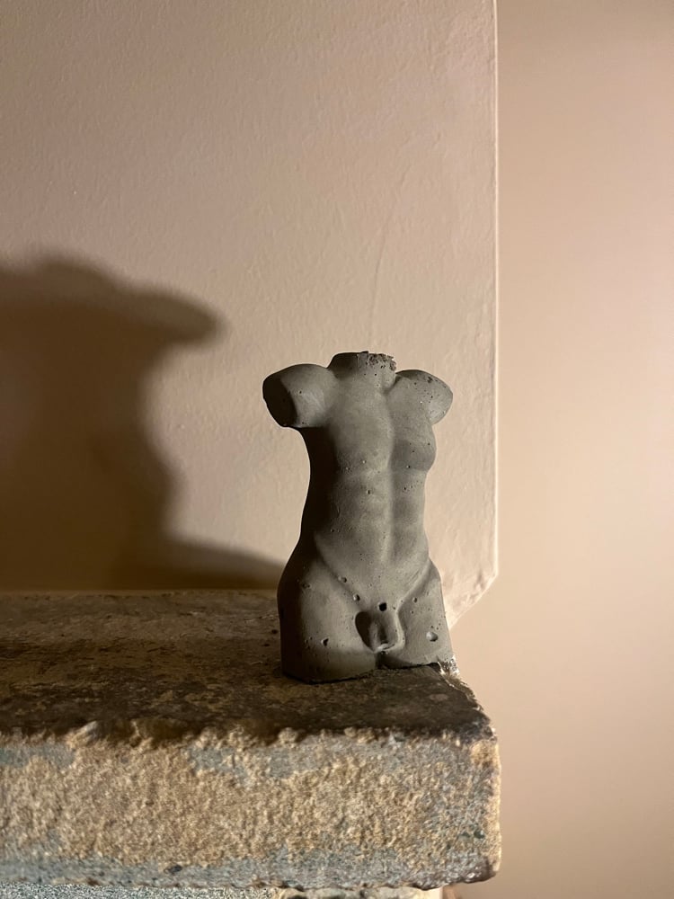 Cement male body standing boldly. The grey colour and texture of this piece add expression to any decor.